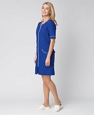 Фартук с двумя накладными карманами и разрезами по бокам. Карманы, горловина, окат рукава и борта обработаны контрастной косой бейкой.